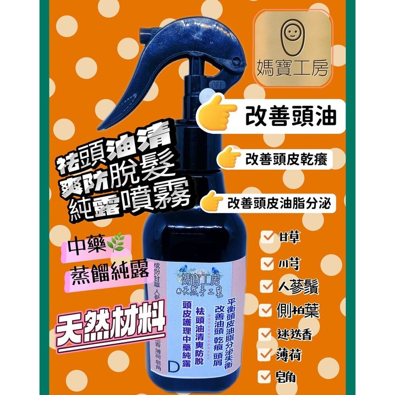 中藥🌿純露護髮- 祛頭油清爽防脫頭皮純露噴霧 功效:頭皮的油脂分泌失衡,可改善頭油,乾癢,頭屑 成份: 1)甘草 2)川芎 3)人蔘鬚 4)迷迭香 5)薄荷 6)皂角 7)側柏葉 等超過7種天然材料蒸餾純露出來,天然有效用! 全店買滿$600免運費,未夠順豐到付 必須下單預訂, 下單後出貨同事致電預約出貨時間